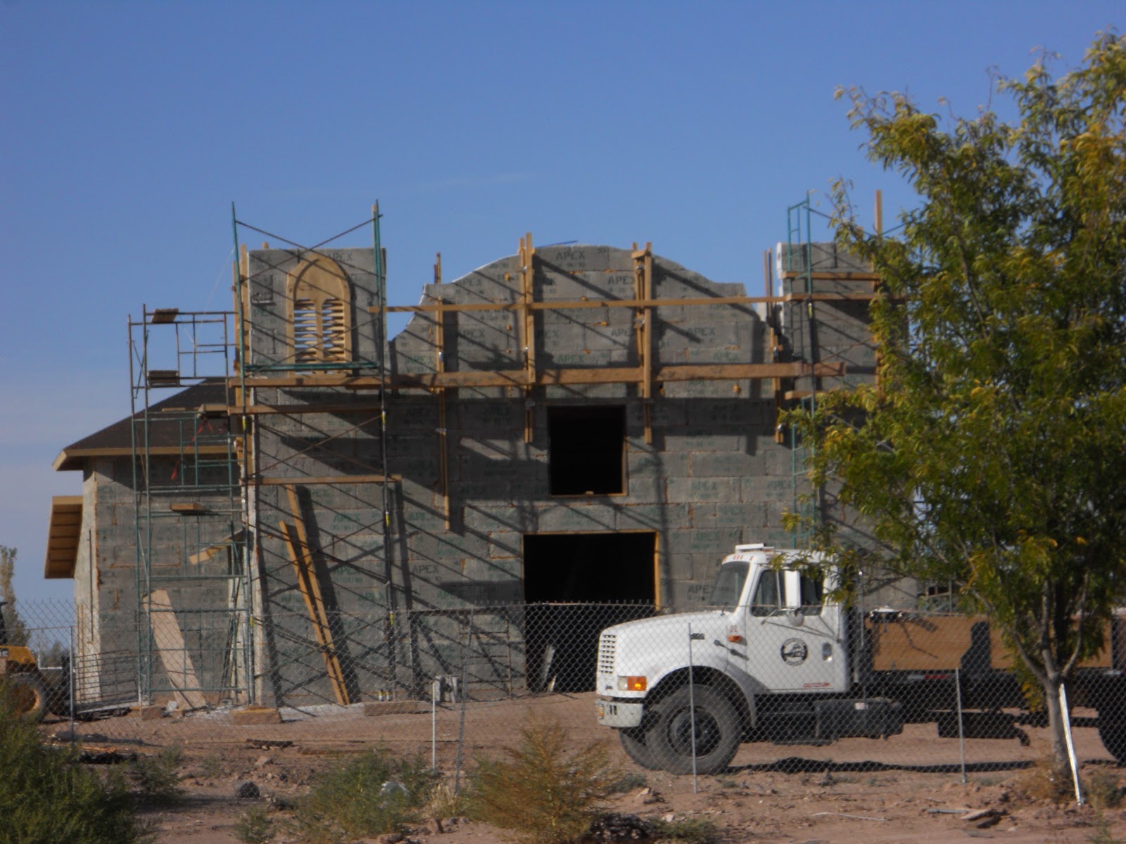 Do you remember last year when Mike, Edna and I walked up to participate in the ground breaking for the Familia de Segrada Mission Church that had collapsed. Here are a couple of pictures of it now. The first photo shows the trusses and roof going on. That is now completed. The second photo I just took two days ago. The men are there every day at 7AM working. The hope is that the church will be finished for New Year's Day, when the Fiesta is held...
